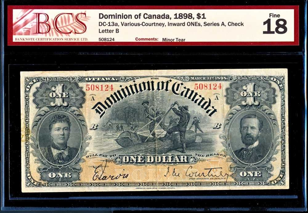 Fine quality note with two deep folds, no major losses, minor tears, Series A, Serial Number B508124, Certified BCS F-18