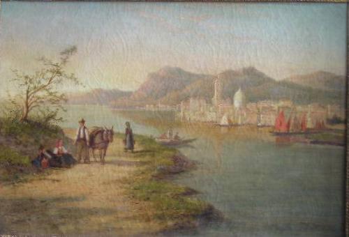 DOMMERSON, William, 1850-1927. "On the Tiber, Italy". Huile sur toile, signée. Titrée verso. École hollandaise. Oil on canvas, signed. Titled verso. Dutch School. 16" x 24" - 40.6cm x 61cm.