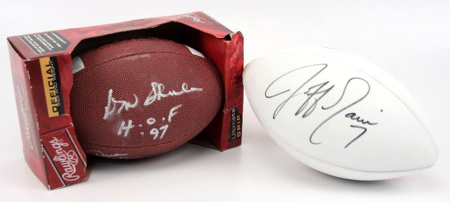 Lot of 2 footballs to include: Rawlings official football signed by Don & Dave Shula "H.O.F. '97" with original box; Jeff Garcia "7" signed Nike football (small girth, official size & weight).