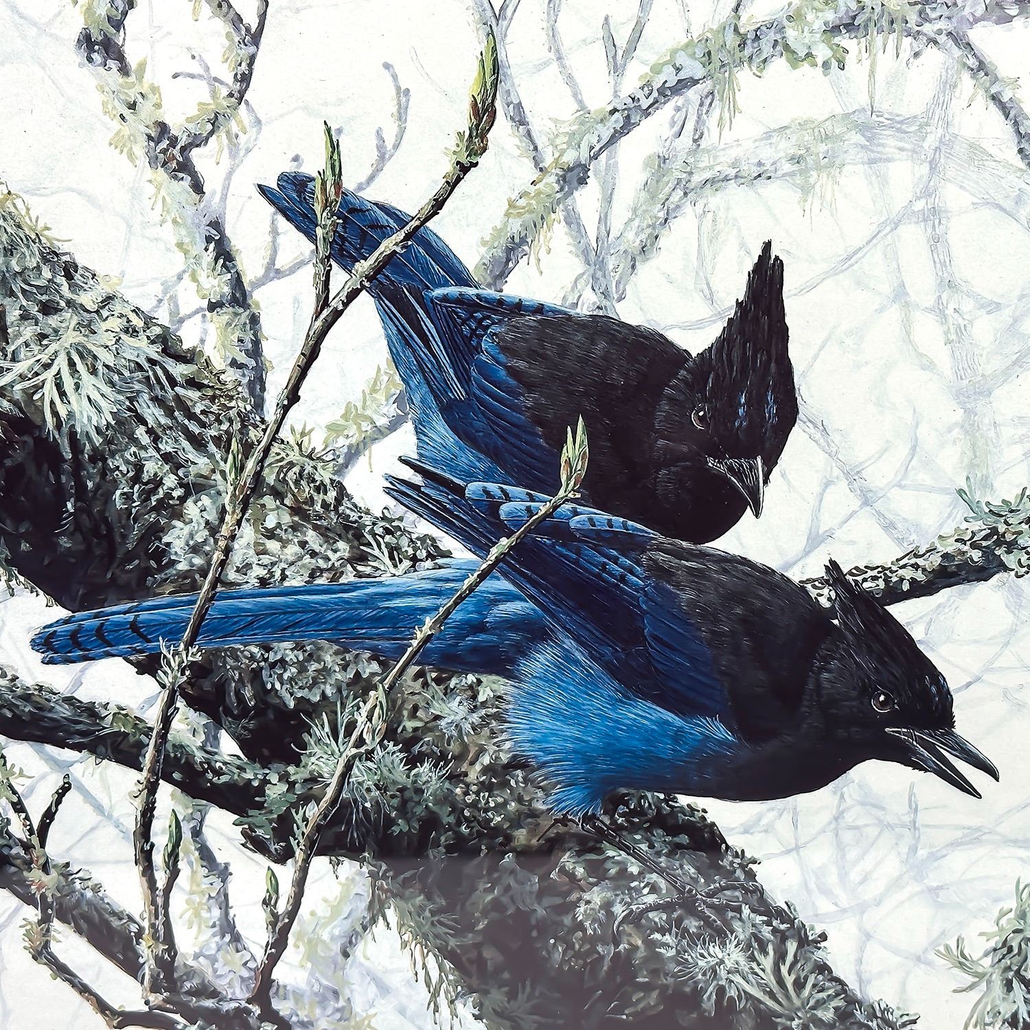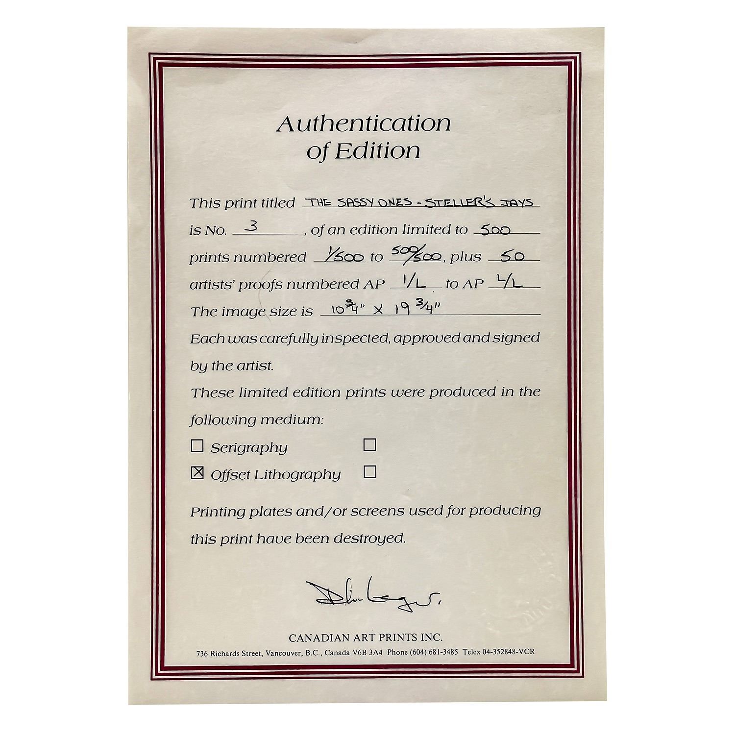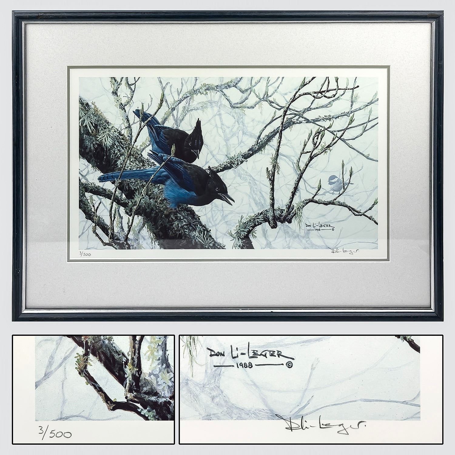 #8540 - HOME OR OFFICE WALL DECOR PICTURE. LIMITED EDITION OFFSET LITHOGRAPH PRINT TITLED “THE SASSY ONES - STELLER JAYS” BY DON LI-LEGER. NUMBERED 3/500 - CERTIFICATE OF AUTHENTICITY. FRAME MEASURES: 28.5” (72 CM) WIDE BY 19.75” (50 CM) HIGH