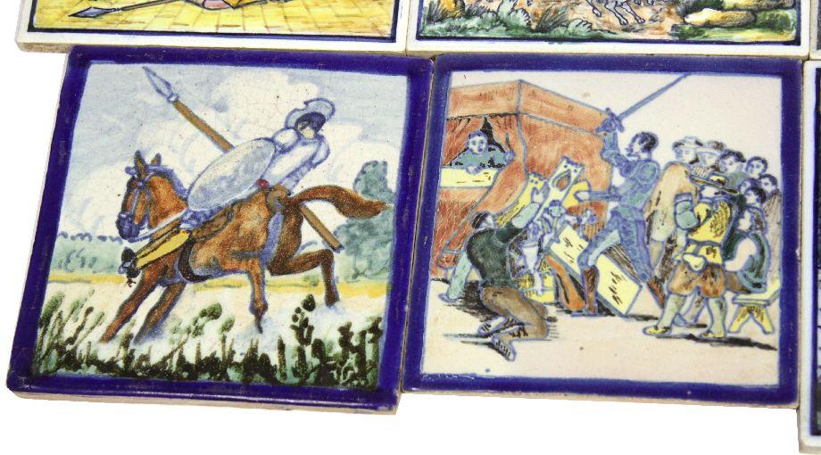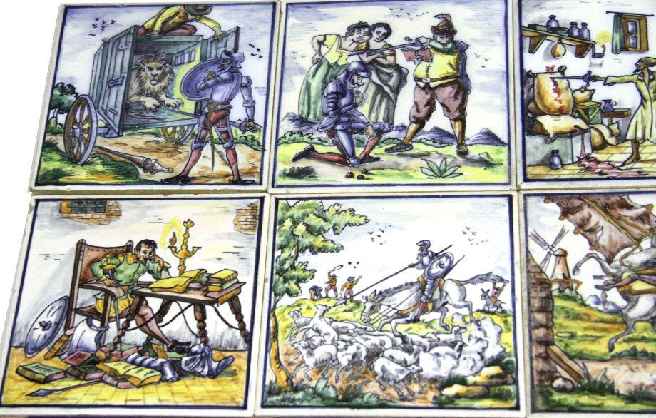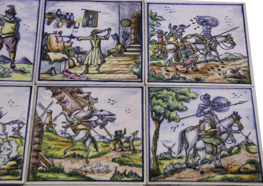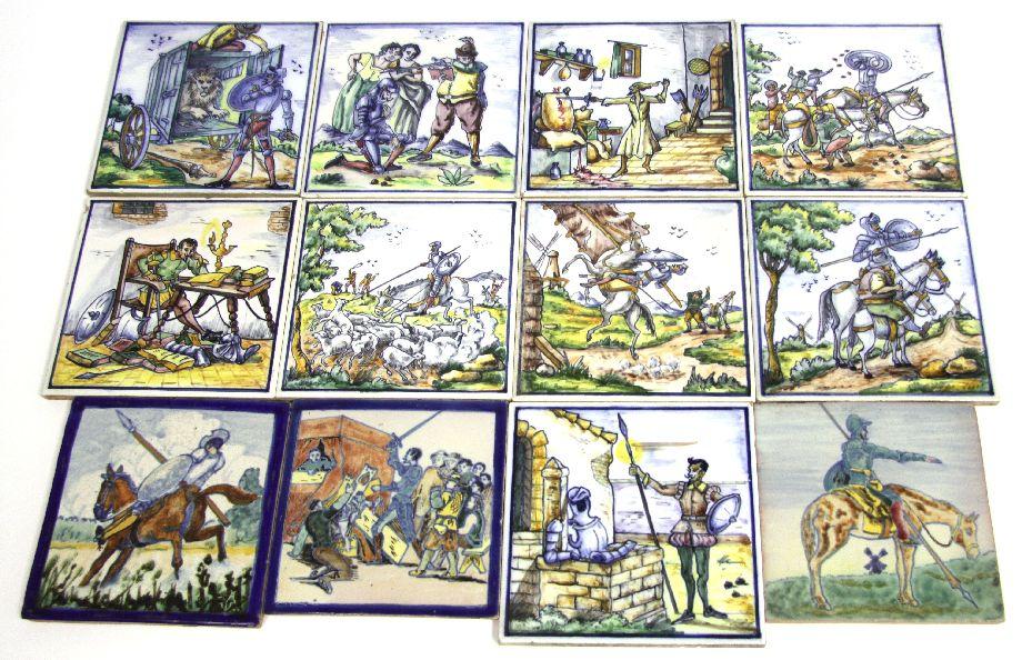 Loy includes twelve hand painted tiles recounting the story of Don Quixote. Two series present, nine with the back signed J. Roig P. Espana Barcelona 6 x 6 inch, Two from a second series with no signature 5.5 x 5.5 inch. All are in excellent condition.