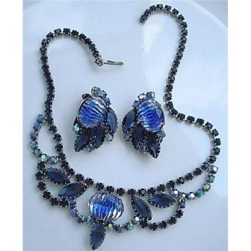 For sale I have a drop dead Gorgeous BLUE RHINESTONE 2-PIECE DEMI PAURE SET. The designer is unknown. On the back there is the number 155 in black. The necklace and clip-on earrings are exquisite! This is much prettier in person. I promise you will not be disappointed in owning this gorgeous set!