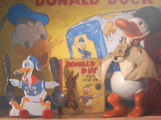 This limited edition print pays tribute to Donald Duck, and to items of Donald Duck memorabilia from days gone by. This "Collector's Shelf" lets you see the way Donald has changed over the years. The variety of items include toys, figurines, as well as food products such as Oatmeal--an early e xample of a cartoon character representing cereal to appeal to children. The artwork is composed in a way to look just like a shelf that you can hang on your wall.