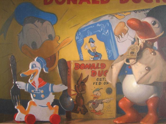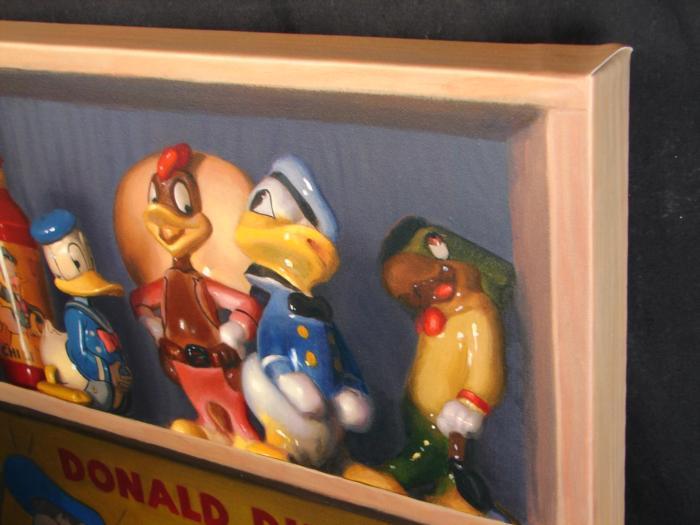 This limited edition art print pays tribute to Donald Duck, and to items of antique Donald Duck memorabilia from days gone by. This "Collector's Shelf" lets you see the way Donald has changed over the years. The variety of items include toys, figurines, as well as food products such as Oatmeal--an early example of a cartoon character representing cereal to appeal to children. The artwork is composed in a way to look just like a shelf that you can hang on your wall.