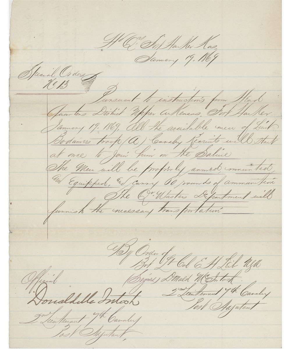 (1838 - 1876) American military officer, first lieutenant who assumed the command of Co. G, killed in the valley fight at the Little Big Horn. Rare manuscript D.S. as 2nd Lt. of the 7th Cavalry, 1p. 4to., Fort Harker, Kansas, Jan. 19, 1869, headed "Special Order No. 13" ordering that cavalry recruits under Lt. Bodamer join him along the Saline River and that they are to be properly mounted, equipped and armed. Boldly signed, fine condition.