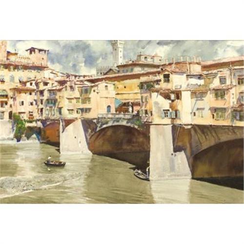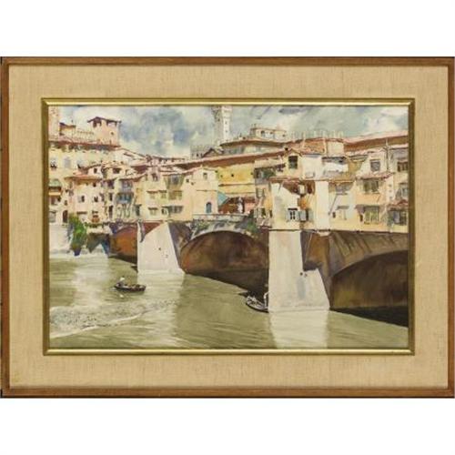 <B>DONALD TEAGUE (American, 1897-1991)</B></I><BR><I>View of Ponte Vecchio </B></I><BR>Watercolor on paper<BR>19 x 28-1/4 inches (48.3 x 71.8 cm)<BR>Signed lower left: <I>Donald Teague N.A.</B></I><BR> <B>Condition Report:</B> Paper has been adhered to board along the edges, otherwise good condition.<BR><BR><b>Shipping:</b> Requires 3rd Party Shipping (<a target="_blank" href="http://www.heritageauctions.com/common/shipping.php">view shipping information</a>)