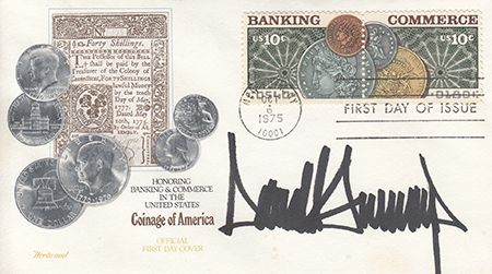 (b. 1946) American business magnate, television personality and author. He is the chairman and president of The Trump Organization and the founder of Trump Entertainment Resorts. A nice group lot of Trump items includes: boldly signed "Banking & Commerce" commemorative cover, Oct. 6, 1975; I.S.P. 8" x 10" b/w; two 4" x 6" index cards signed; WITH IVANA TRUMP, S.P 5" x 7" color. Good for idolization...or wrapping fish.