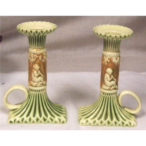 THESE ARE A WONDERFUL SET OF ROSEVILLE CANDLESTICKS CALLED DONATELLO.THEY ARE A BEAUTIFUL ST OF CANDLESTICKS. IT IS RARE TO FIND A SET SIX INCHES TALL.THESE CANDLESTICKS HAVE A HANDLE AND VERTICAL LINES IN GREEN AND CREAM BUT IN THE CENTER IT HAS TWO NYMPHS ONE ON EACH SIDE.ONE HAS A VERY SLIGHT CHIPAND THEY BOTH HAVE NATURAL CRAZING.YOU COLLECTOR'S OF ROSEVILLETHESE WOULD MAKE A NICE ADDITION TO YOUR COLLECTION. YOU ROSEVILLE COLLECTOR'S CHECK THIS OUT!!!