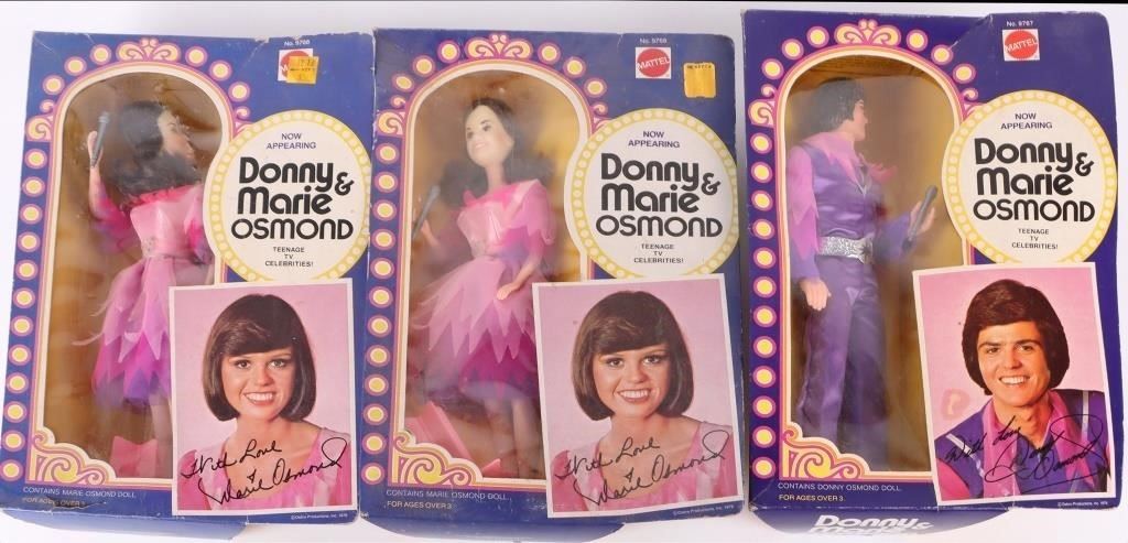 1976 Donny and Marie Osmond Mattel Dolls New in Box to include (2) Marie dolls and one Donny doll.