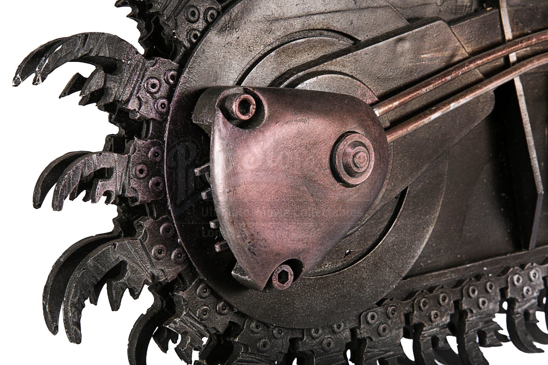 Intentionally distressed for production, the saw is painted to resemble worn metal, and the blades’ steely grey fade and metallic hues create a futuristic look. The saw shows minor production-based wear, and two of the teeth are damaged. Dimensions: 110 cm x 42.5 cm x 32 cm (43 ¼” x 16 ¾” x 12 ½”)