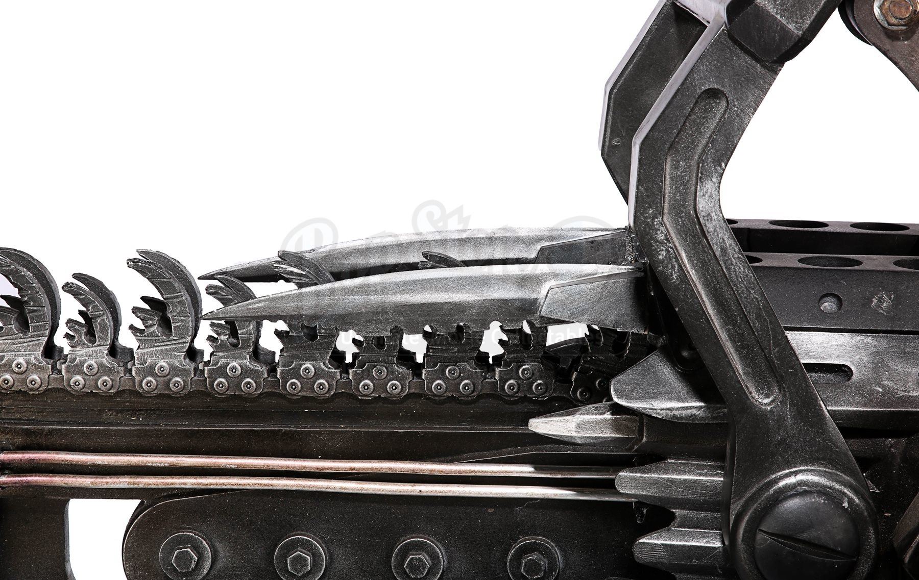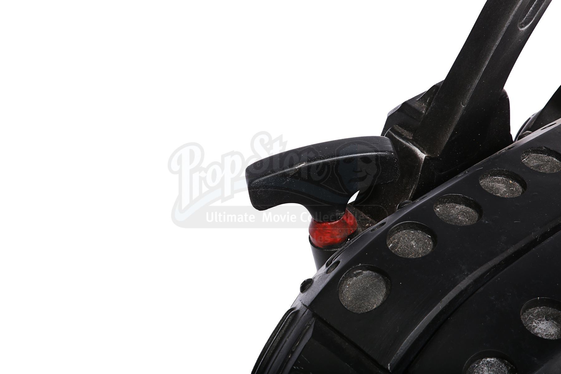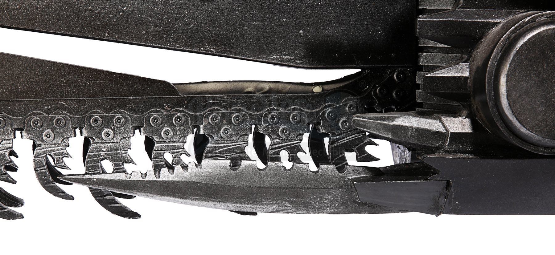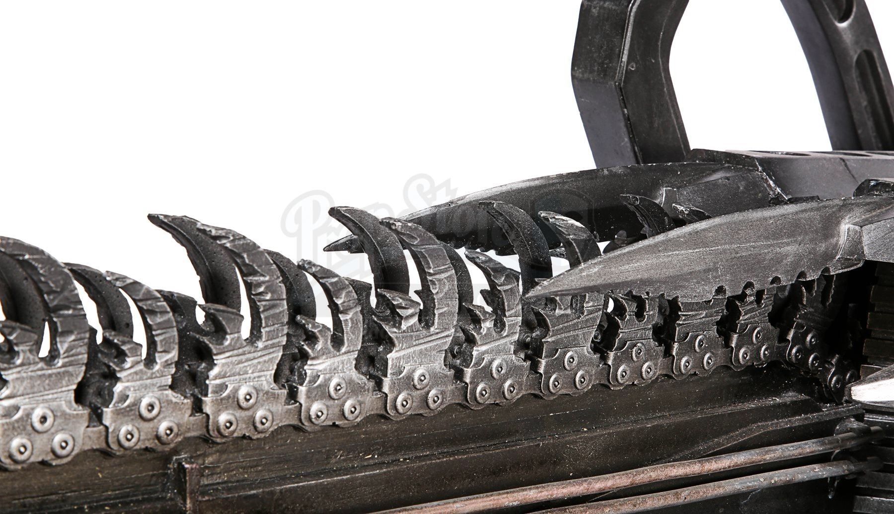 This heavy resin and fibreglass chainsaw features a large grip to the right of the engine, with a second mounted over the top — both are secured with metal bolts. On the left is a rip cord that can be pulled, but is inactive. The resin guard mounted over the blade features two protruding knife-like blades. The main blade is made of resin, featuring two chains of serrated teeth and chunky mechanical details.