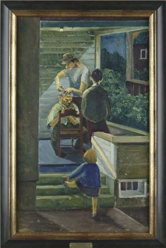 DORIS EMRICK LEE (American, 1905-1983) THE PORCH BARBER. Oil on canvas scene shows a man cutting another man's hair while seated on a porch. A young girl and boy look on. Signed lower left green on green which is very hard to discern. Housed in a fine modern green painted and gilt frame with modern name plaque on frame. SIZE: 29" x 18". CONDITION: Some areas of thinning surface paint, good. 9-27718