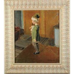 Lot # 60 DOROTHEA SHARP (British, 1874-1955) “STUDY FOR “VIVI AT PLAY” 1926”. Oil on canvas interior scene shows a young blonde haired girl in green dress holding doll in one arm and walking stick in other. A ball sits on rag runner, doorway is background. Titled at bottom center “Vivi”. Bottom right dated with artist cipher and signed “Dorothea Sharp”. Back of canvas has title, date and artist name. Housed in a modern gesso decorated frame with leaf design. SIZE: 22””x 18-1/2”. CONDITION: Very good. 9-99184 (2,500-3,500)