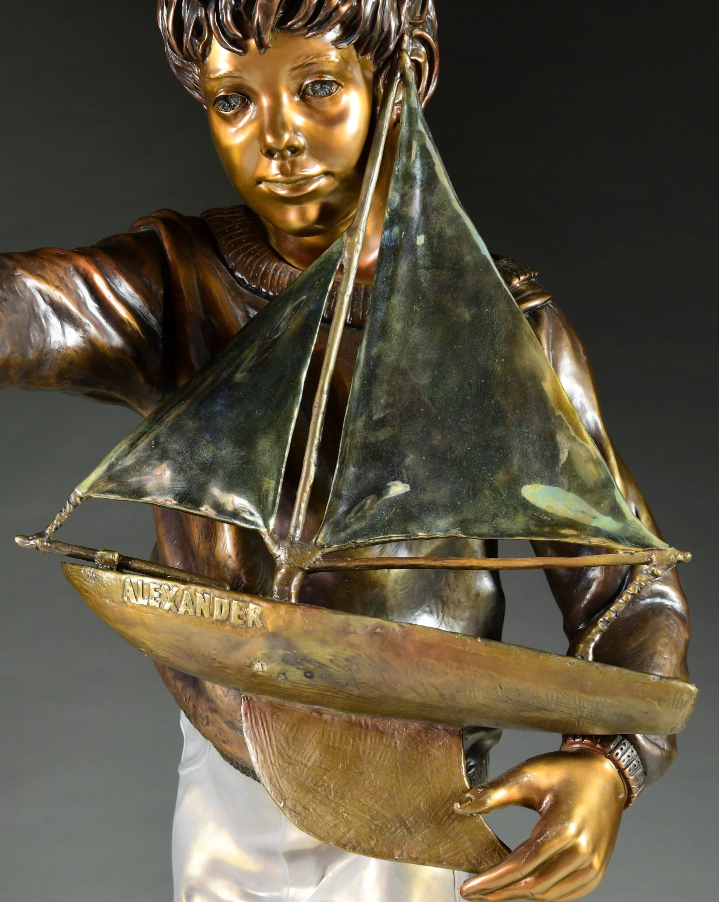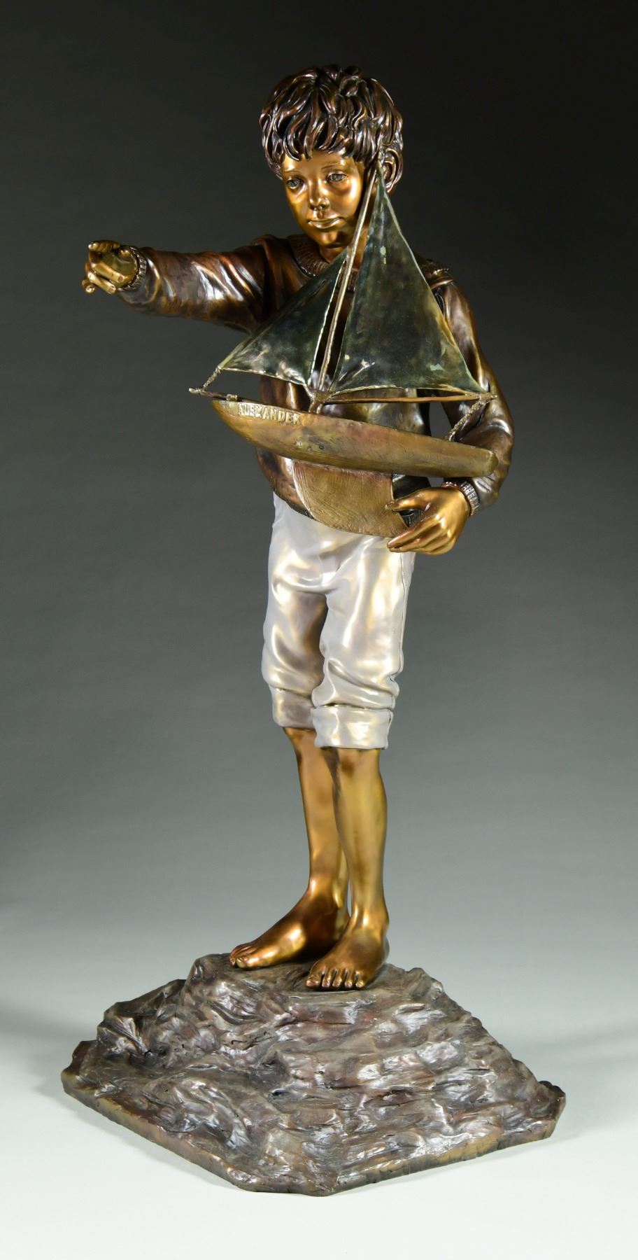 Beautiful life size figural bronze of a young boy holding a sailboat with the name 'Alexander' in his left hand. The boy stands on a rockwork plinth, pointing with his right hand. The limited edition bronze with impressed mark at rear with "15/15" of which this is the final example of the limited edition. Also marked with a clover symbol which we believe to be the foundry mark. SIZE: overall 51" h, boat is 17 1/2" x 15". CONDITION: very good original condition with undisturbed patinated surfaces. The boat at one time has been reattached to the boy's hand. (05-1023/TG). $800-1,200.