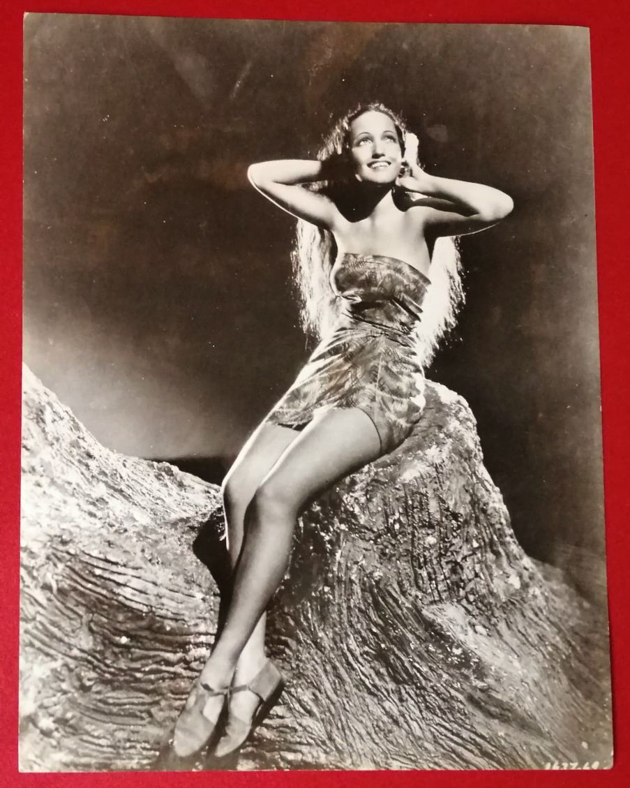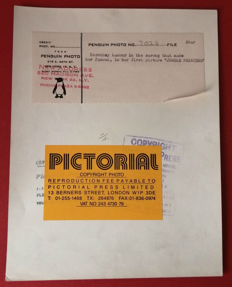 Vintage photo of Dorothy Lamour in the sarong that made her famous in her first picture "Jungle princess". Press stamps on verso. 9x7 inches.