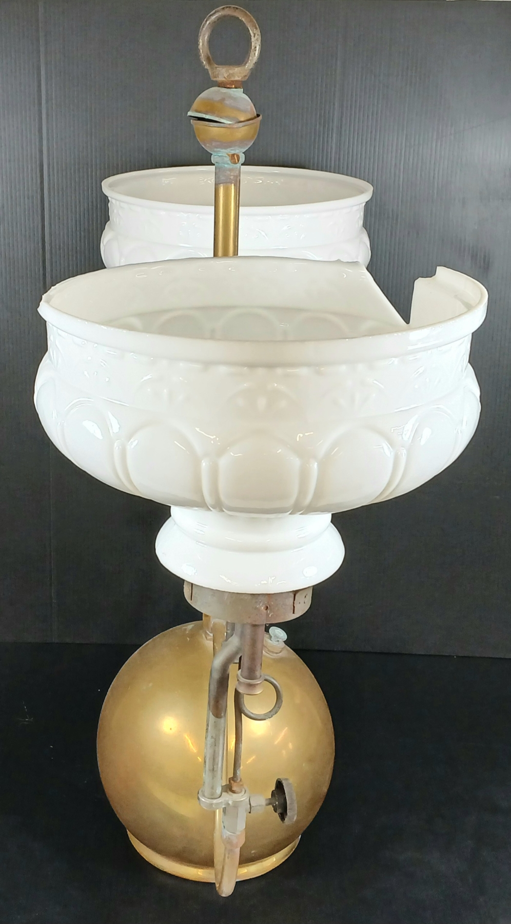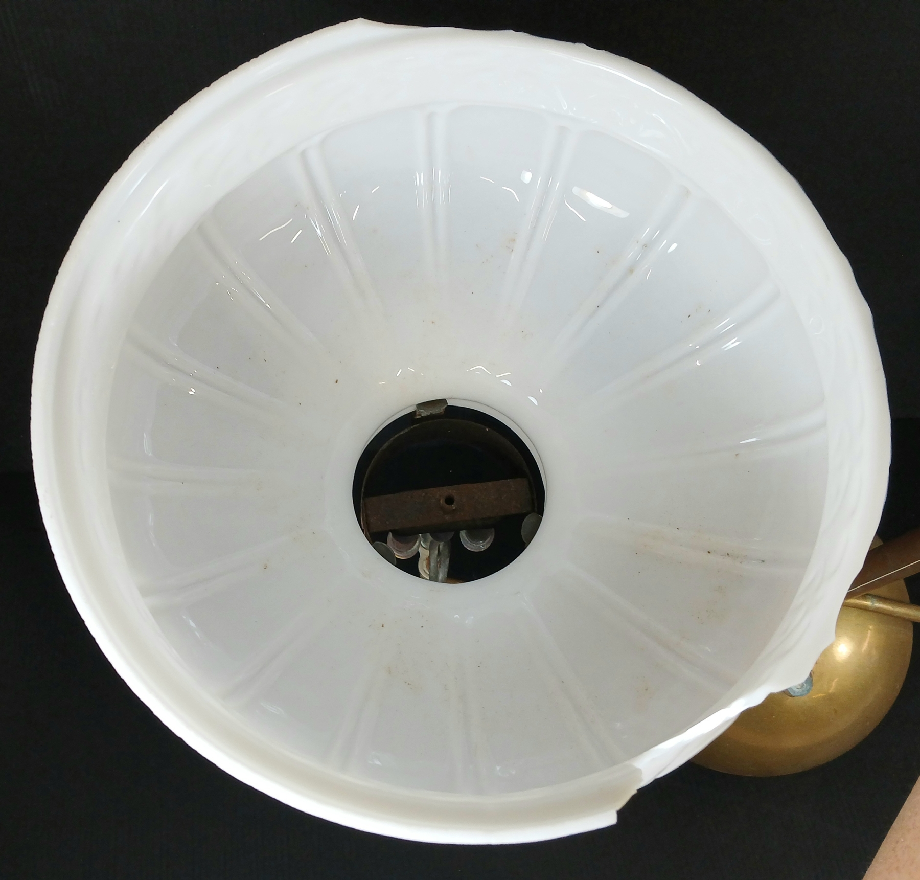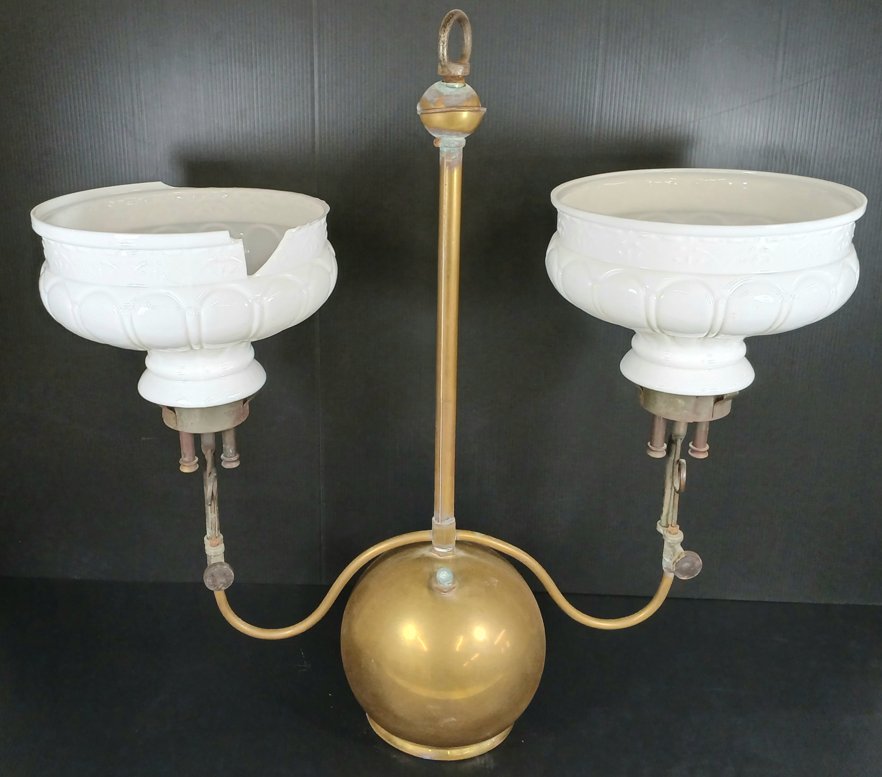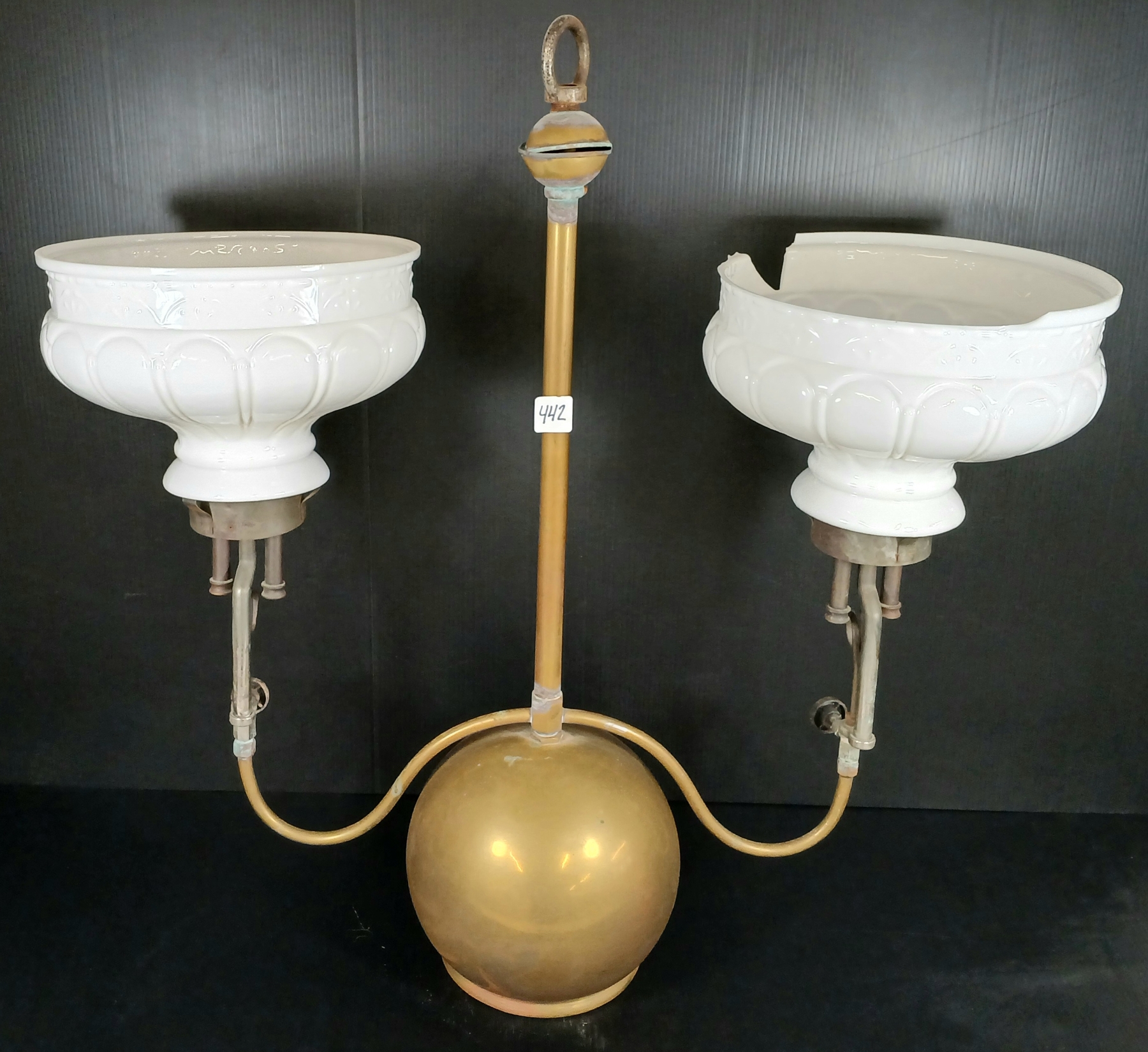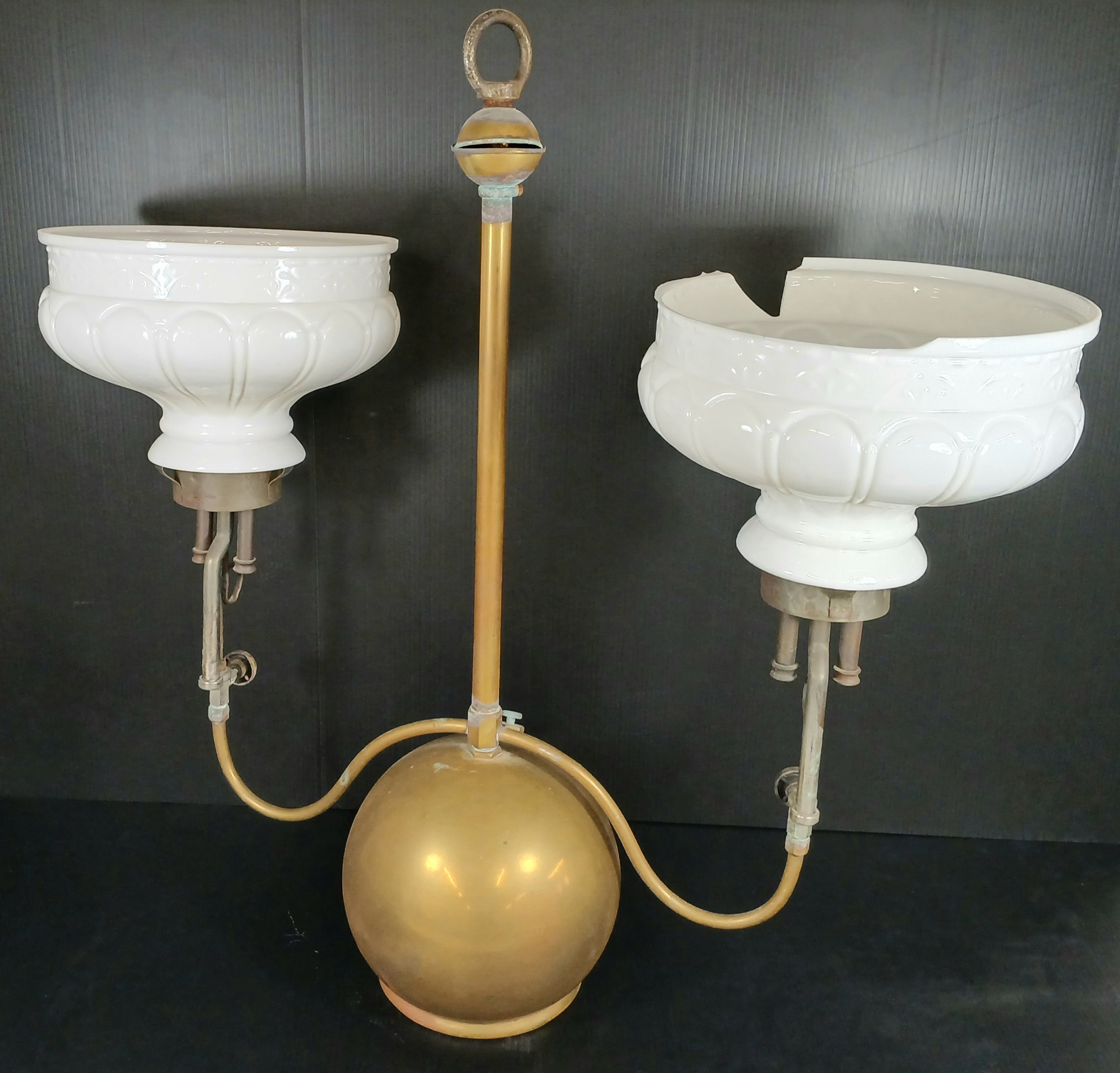 NOTE: MILK GLASS SHADES ON A BRASS BASE - WORKING CONDITION UNKNOWN - UNMARKED.