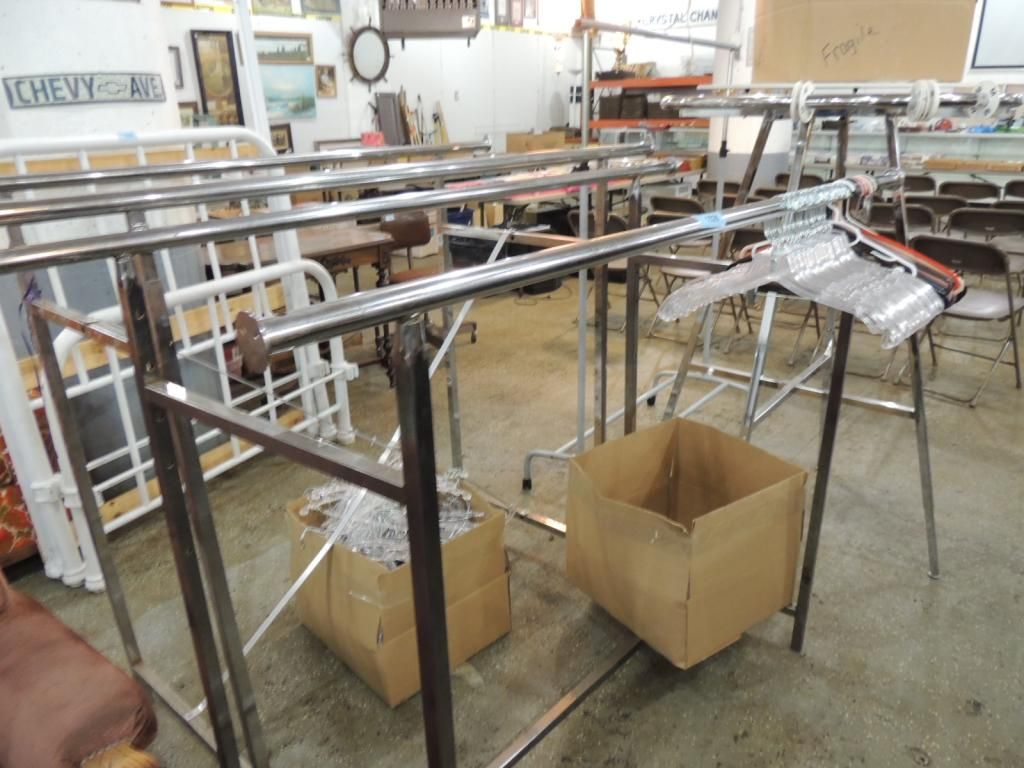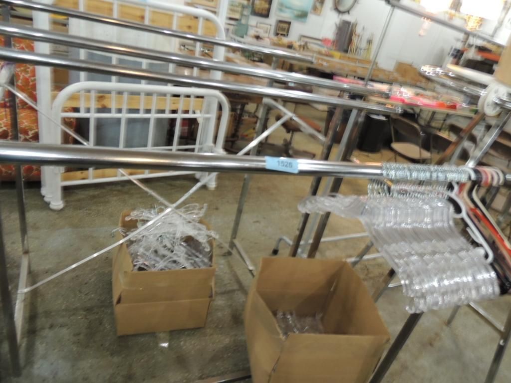 DOUBLE BAR ADJUSTABLE CLOTHES RACK TWO ROD WITH BOX HANGERS. STURDY. AS SHOWN SEE PHOTO FOR MORE DETAILS.