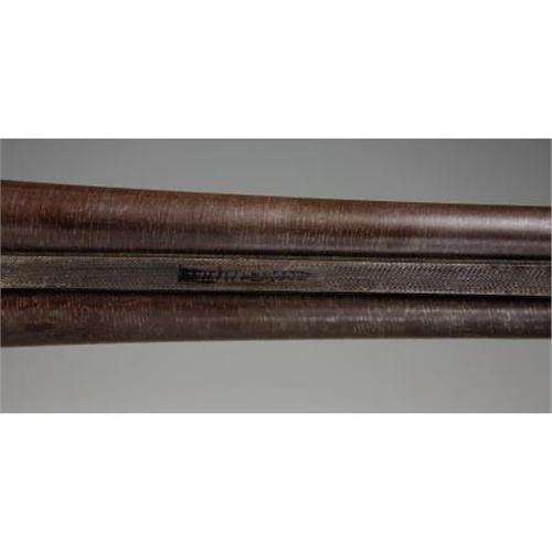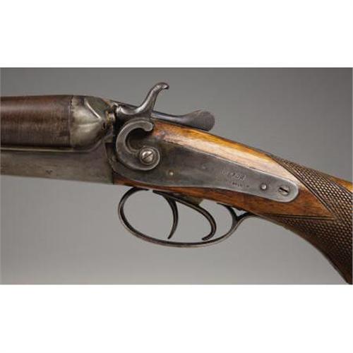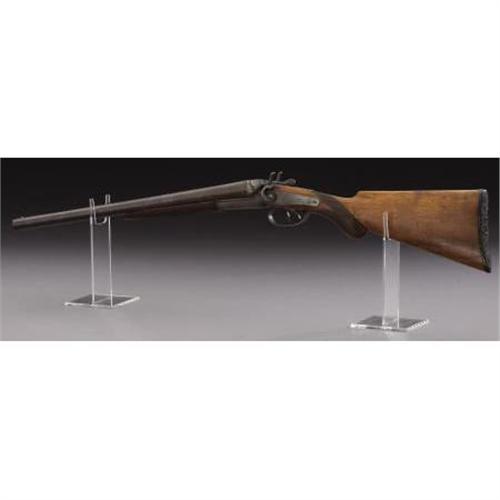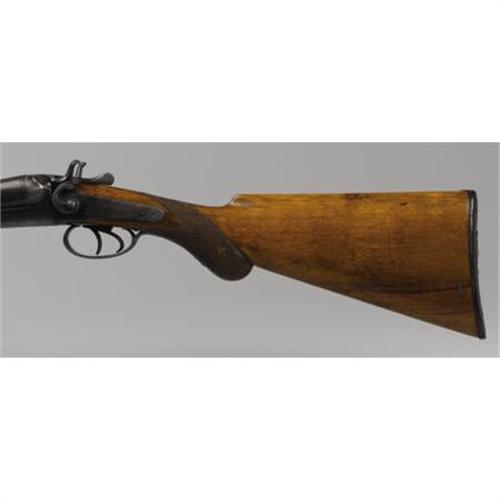 <B>DOUBLE BARREL HAMMER SHOTGUN</B></I> - Serial number 3231, circa 1870s. 19” barrels in .12 gauge caliber. Top barrel rib marked “BELGIUM-LAMINATED STEEL”. Back action locks marked “W. RICHARDS-BELGIUM”. Checkered forend and pistol gripped stock. Fancy hard rubber shotgun butt plate depicting a hunter seated on a log with his dog.<BR><BR><B>Condition:</B></I>Approximately twenty or so case hardening evident on frame, lock plates and hammer. Good, strong Damascus striping present on barrels. Trigger guard basically brown. Wood sound with normal wear.<BR><BR><b>Shipping:</b> Bats, Clubs, Sticks, Swords, Rif (<a target="_blank" href="http://www.heritageauctions.com/common/shipping.php">view shipping information</a>)