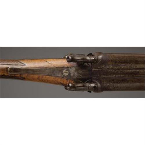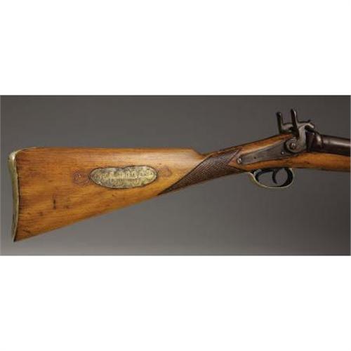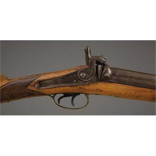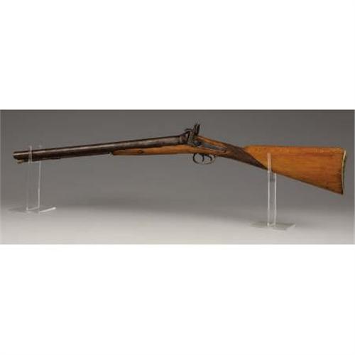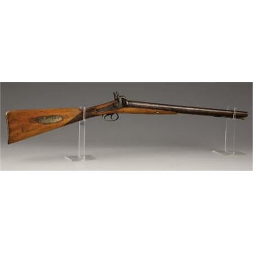 <B>DOUBLE-BARREL PERCUSSION SHOTGUN</B></I> - 21¼" length barrels in 12 gauge. No markings on lock plates or barrels, but probably of Belgium manufacture based on configuration. Circa 1850-1860. All furniture is German silver. A brass plaque has been added to the right side of the stock spuriously stamped "Jesus Maria Sena y Baca." <BR><BR><B>Condition:</B></I> Wood heavily cleaned. Metal patina relatively uniform. Silver furniture nicely patinated.<BR><BR><b>Shipping:</b> Bats, Clubs, Sticks, Swords, Rif (<a target="_blank" href="http://www.heritageauctions.com/common/shipping.php">view shipping information</a>)