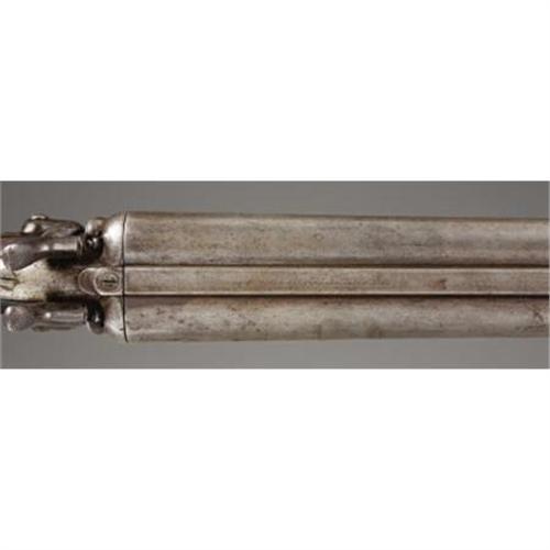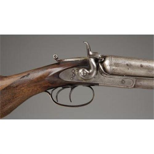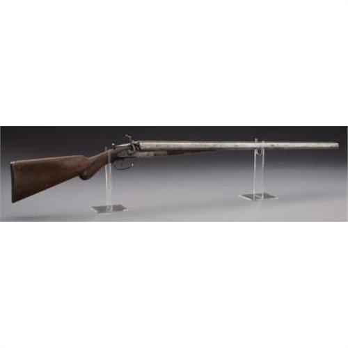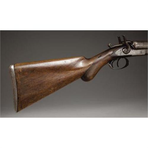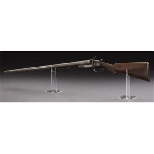 <B>DOUBLE BARRELED HAMMER SHOTGUN</B></I> - Serial number 4021, circa 1870s. 28” barrels in .12 gauge calibre. Top rib on steel barrel is marked “E. REMINGTON”, etc. Earliest of Remington shotgun line style barrel release mechanism. Checkered forend, bag style pistol grip and shotgun butt. Stamped with a spurious “W.F.& Co.” on face of barrel and receiver water tables using single letter die stamps.<BR><BR><B>Condition:</B></I>All metal surfaces are basically light grey in color. Checkering is worn smooth with only the basic pattern remaining. A little extra finish applied to the wood some time ago is still evident, mainly on the stock.<BR><BR><b>Shipping:</b> Bats, Clubs, Sticks, Swords, Rif (<a target="_blank" href="http://www.heritageauctions.com/common/shipping.php">view shipping information</a>)