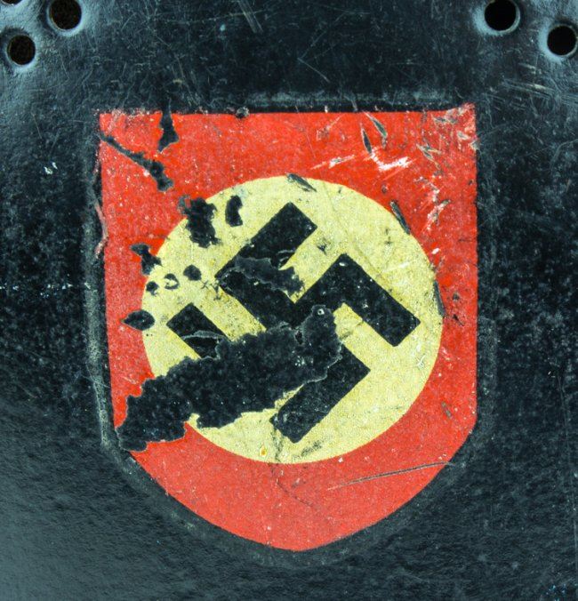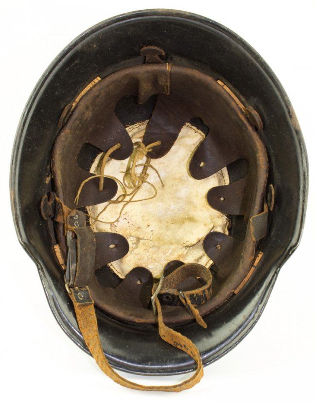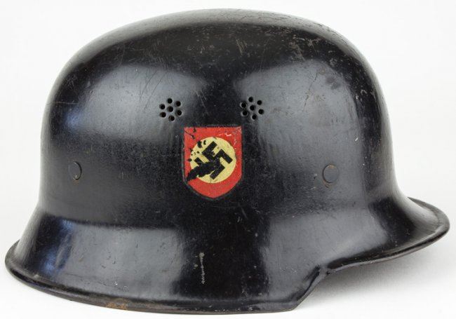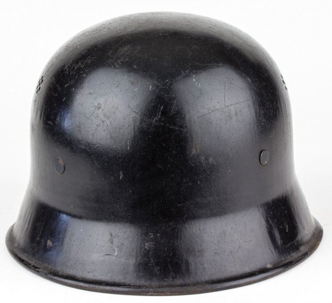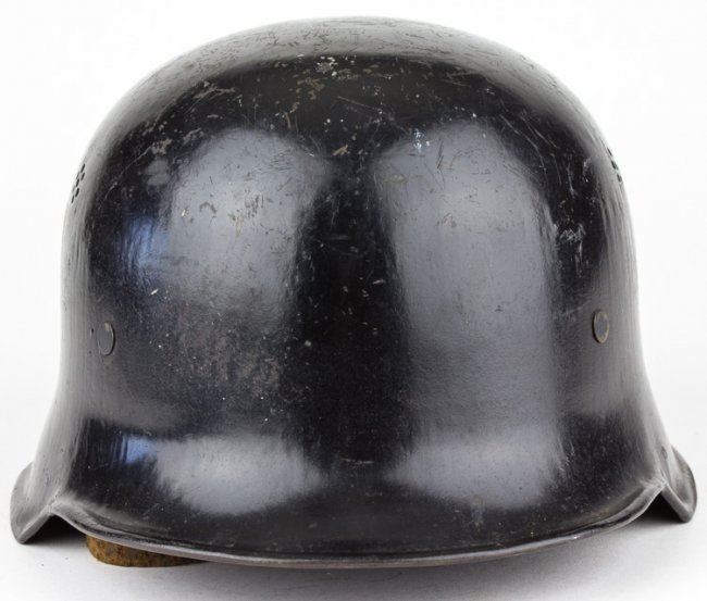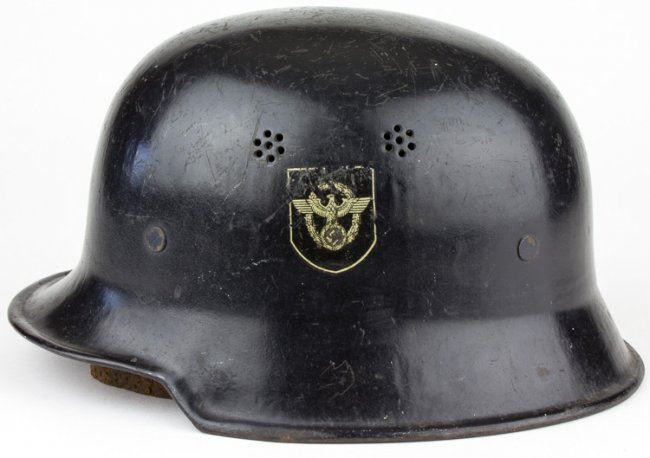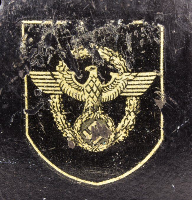 Steel double-decal police helmet, black with swastika and national eagle decals on either side, each about 80% intact. The shell bears two ventilation holes on each side and paint remains quite good. Leather liner and padding within remain good, chin strap is broken at one bale.