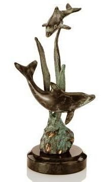 DOUBLE DOLPHINS BRONZE SCULPTURE - 8"H 3.5"W 3 "D - GREAT ATTENTION TO DETAIL - BEAUTIFUL FINISH - LOST WAX CAST- MOUNTED ON MARBLE BASE
