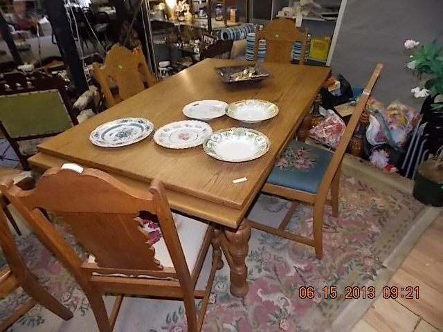 DOUBLE DRAW LEAF TABLE - 1" OAK - & 4 CHAIRS (ASSORTED NEEDLE POINT COVERED) - TURN OF THE CENTURY