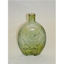 DOUBLE EAGLE PINT FLASK, AQUA W/ STRONG OLIVE GREEN STRIATIONS RUNNING THROUGH IT, GII-24, OPEN PONTIL