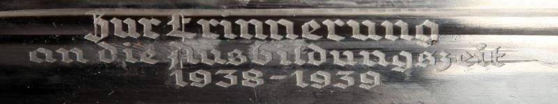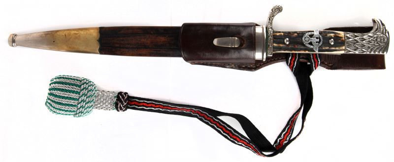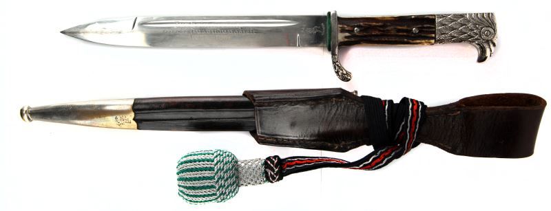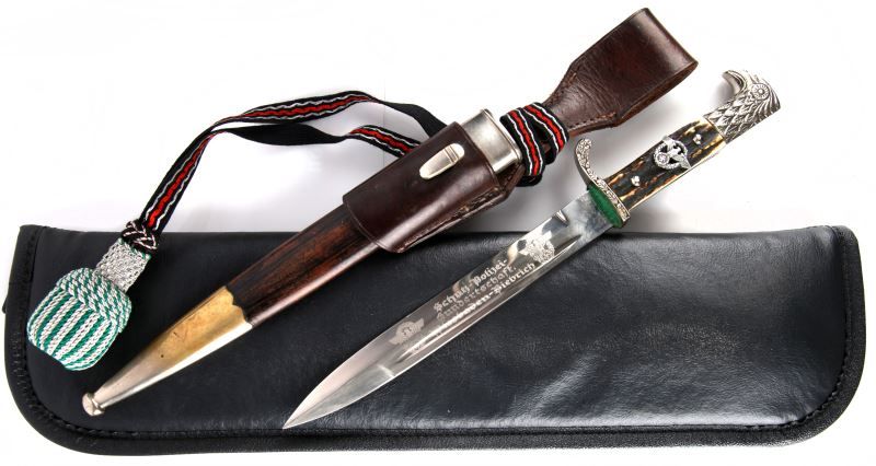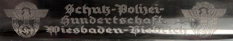 German police dress bayonet with WWII commemorative etching on both sides of blade. "Schutz-Polizei hundertschaft wiesbaden-biebrich" and "zur erinnerung an die ausbildungszeit", on opposite side. Maker marked E. P. & S., Solingen. Birds head pommel, with stag handle grips. Black leather scabbard with metal throat and chape, brown leather frog, and portepee. Minor wear to scabbard, otherwise overall very good to excellent condition. This lot has a reserve.