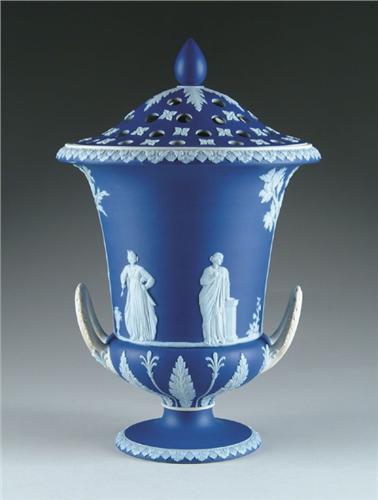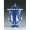 DOUBLE-HANDLED WEDGWOOD BOUGH POT. This magnificently striking early Wedgwood has a beautiful Jasper blue background with full standing classical female figures and trees decorating the sides. Elaborate attached white handles on the sides. Topped with original open work lid that is ornamented with white flowers and leaves. Signed on underside, "Wedgwood". SIZE: 15 in. to top of finial. CONDITION: Some of the applied work has separations which occurred at the time of drying, however there is no damage and the color is very strong and bright. 5-61511
