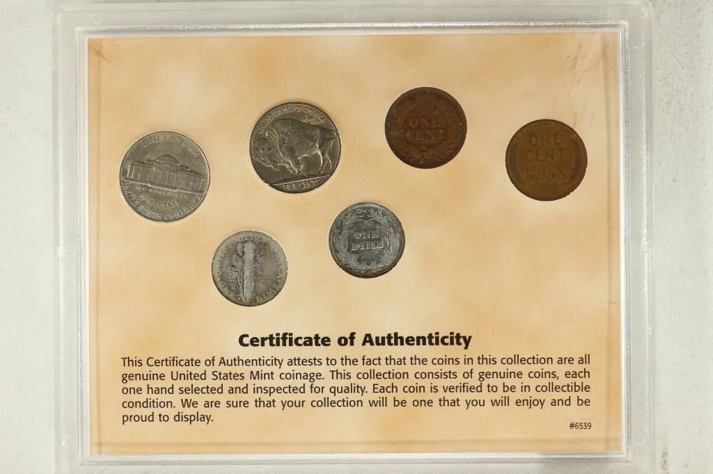 INDIAN HEAD CENT AND LINCOLN CENT, 1938 BUFFALO NICKEL AND JEFFERSON NICKEL & 1916 BARBER DIME AND MERCURY DIME (S)
