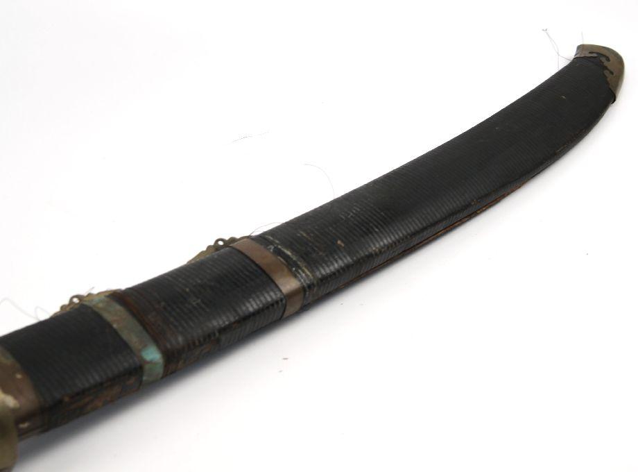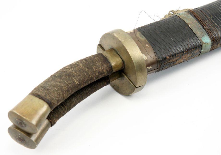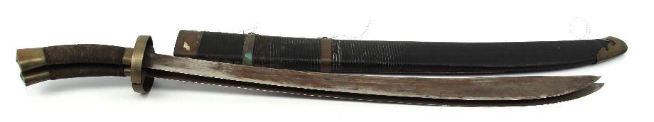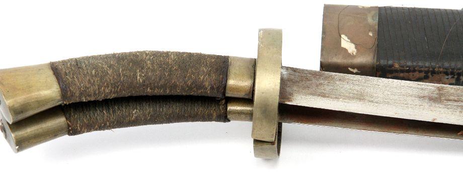 A Double set of kampilan type swords, appearing to be from the Philippines, likely around mid 20th Century. 31 inch double fullered blades, both fitting into a single bamboo scabbard. Probably made as a tourist novelty. Surface rust on blades, and wear to scabbard.