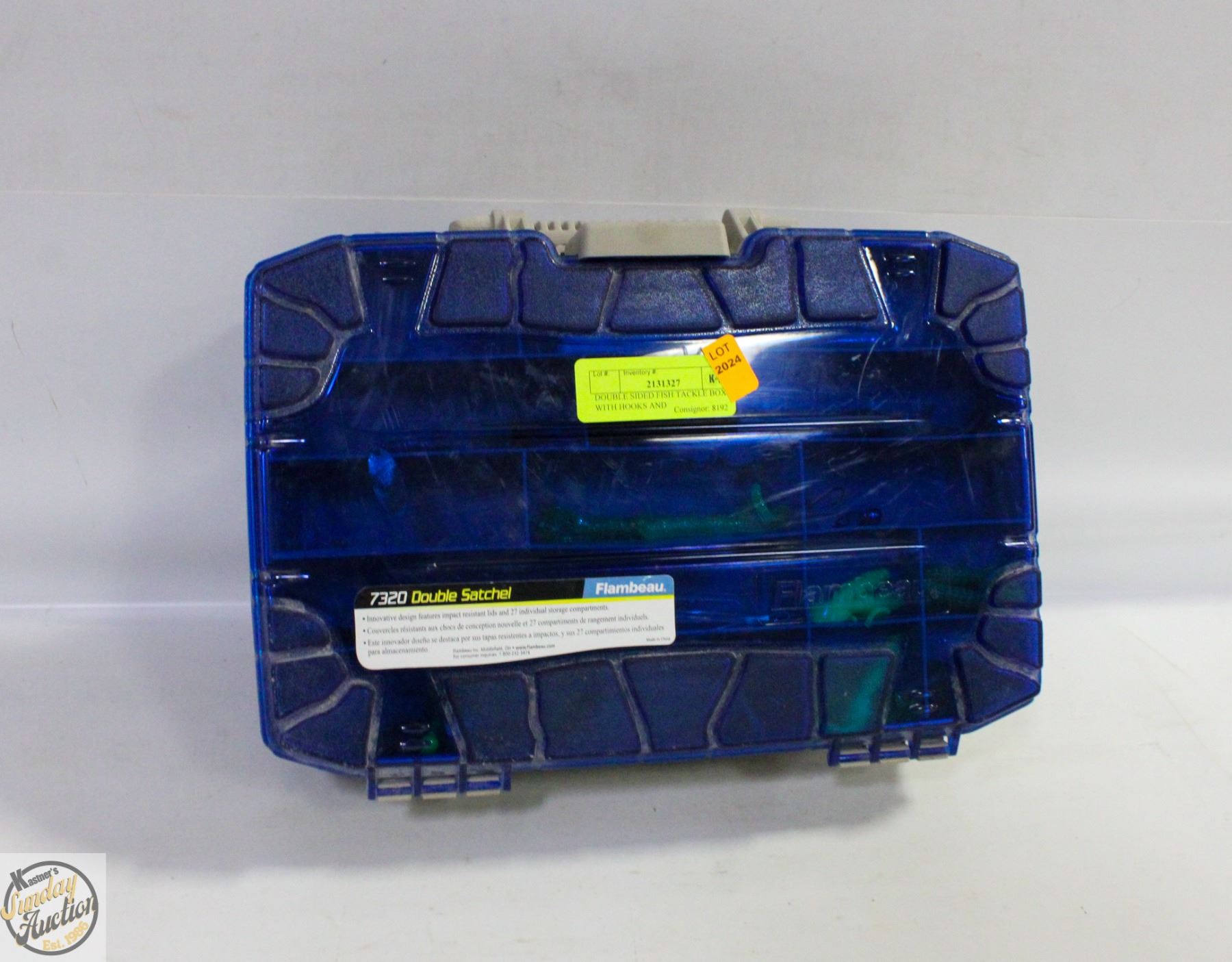 DOUBLE SIDED FISH TACKLE BOX WITH HOOKS AND