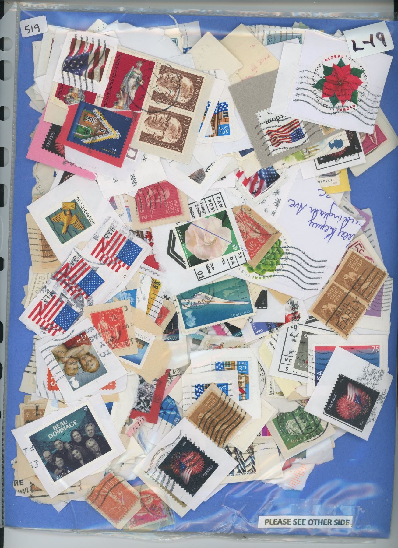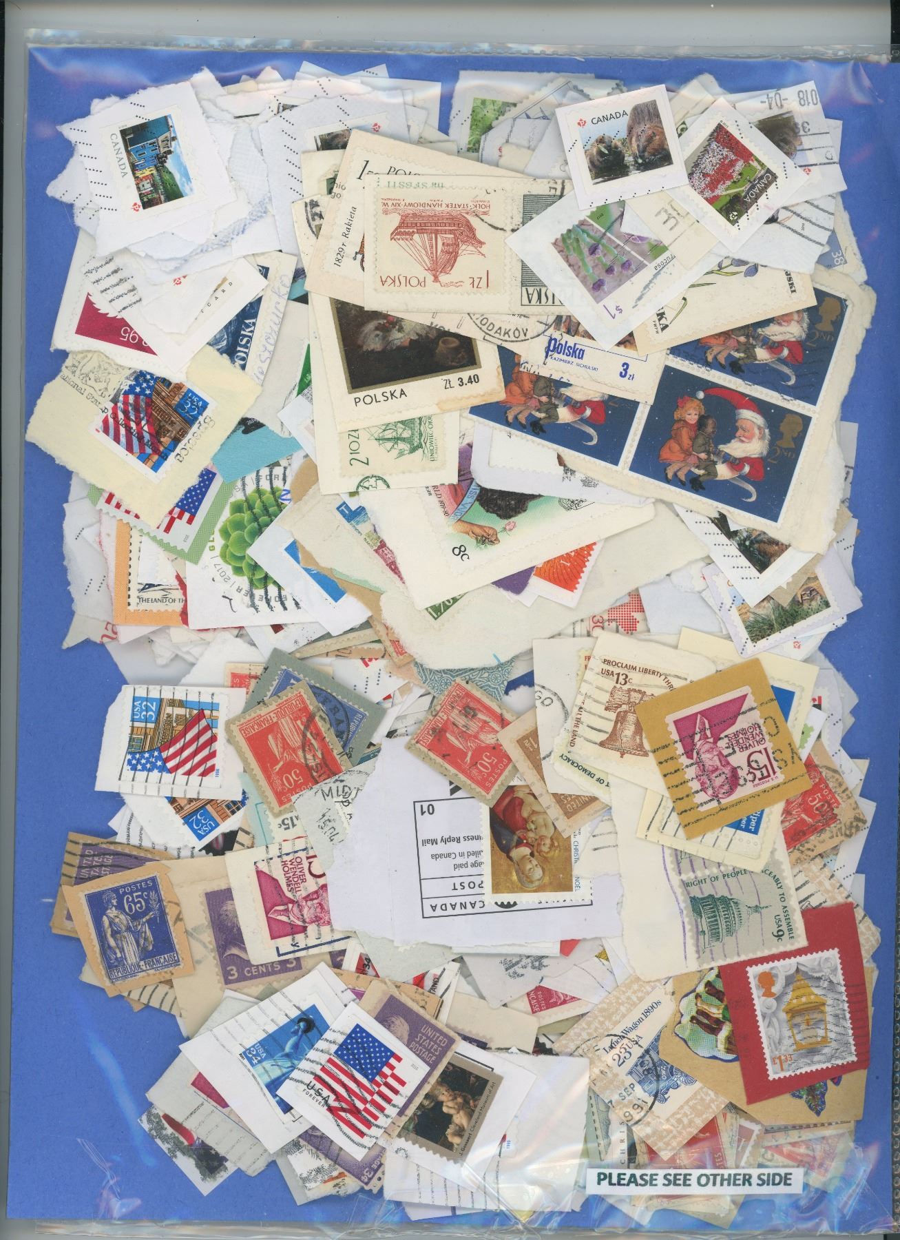 DOUBLE SIDED PACKAGE OF STAMPS- CANADIAN & FOREIGN- GREAT FOR SCRAPBOOKING PROJECTS