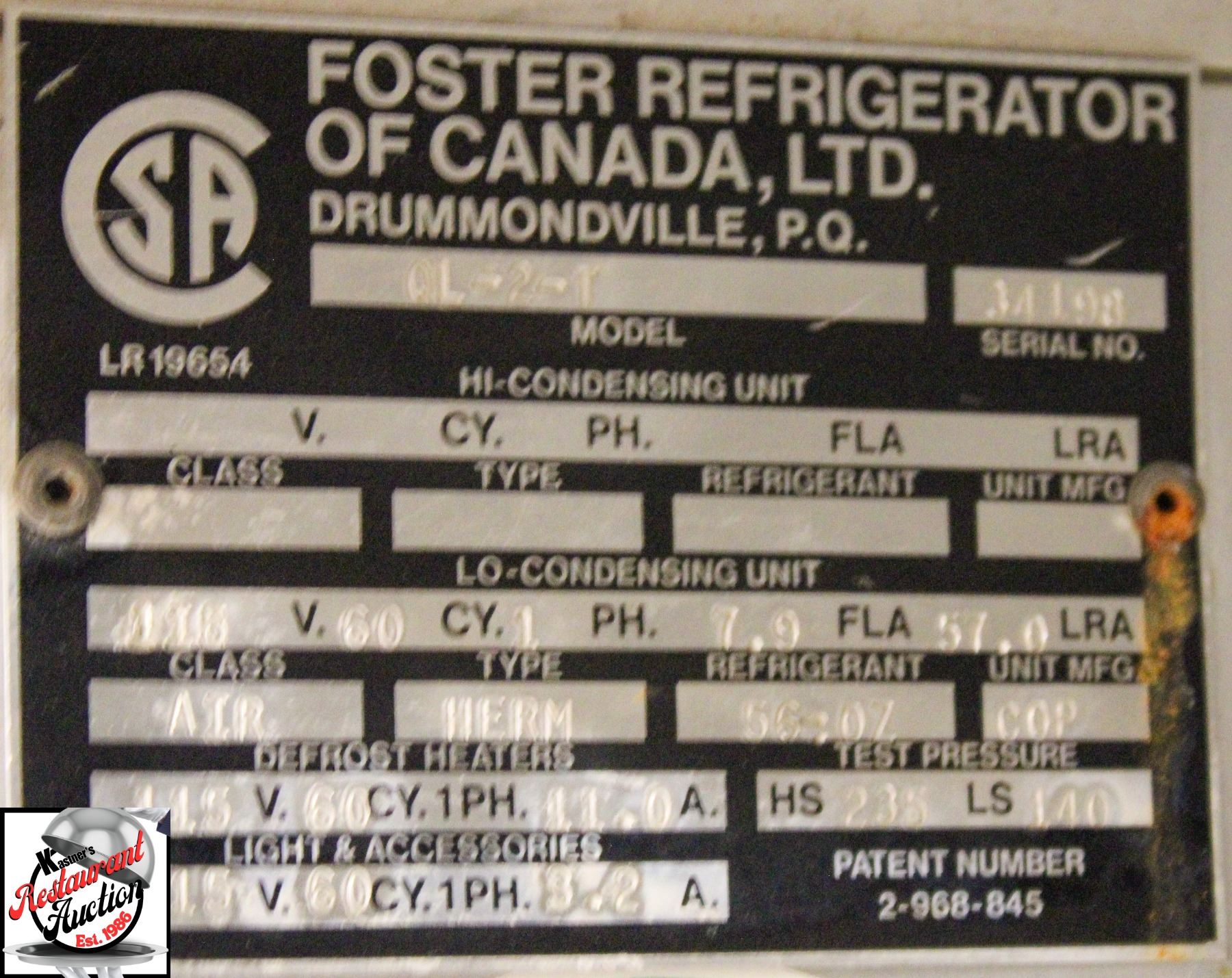 MANUFACTURER: FOSTER REFRIGERATOR OF CANADA LTD., MODEL #: QL-2-T, 115 VOLTS, 60 HZ, 7.9 AMPS, 57" X 33" X 78"