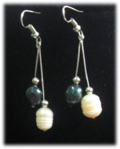 DOUBLE TEARDROP BLACK AND WHITE PEARL DANGLING EARRINGS **|**|** DOUBLE TEARDROP BLACK AND WHITE PEARL DANGLING EARRINGS;AUTHENTIC PHILIPPINE PEARLS;METAL-SILVER ; MSRP: $100