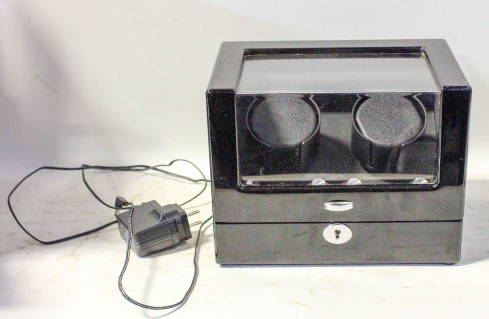 BLACK DOUBLE WATCH WINDER WITH LOCKING CASE ADAPTER CORD INCLUDED CAN USE D BATTERIES