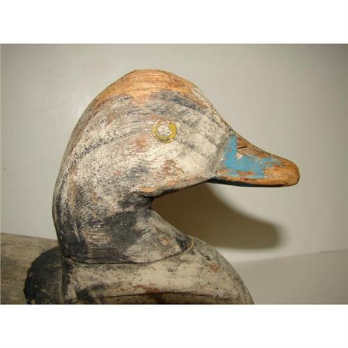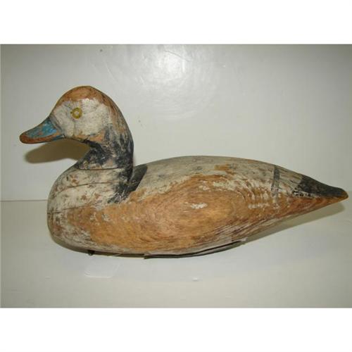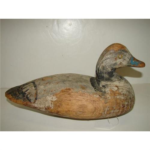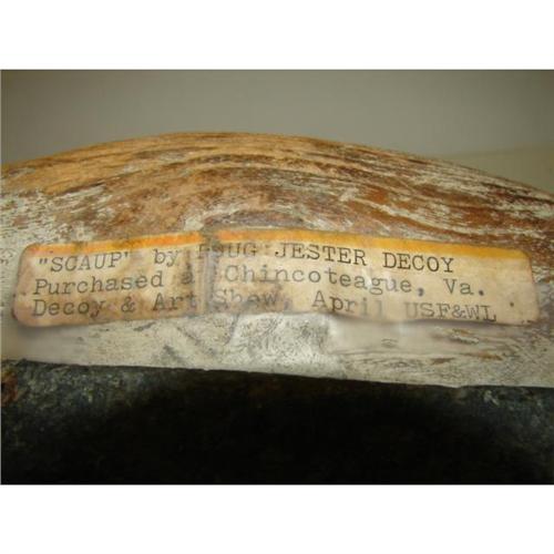 DOUG JESTER, CHINCOTEAGUE, VIRGINIA, BLUEBILL DECOY. Shows severe wear and weathering of wood and loss to paint. Tag on bottom reads “Scaup by Doug Jester Decoy/Purchased at Chincoteague, Va./Decoy & Art Show, April USF&WL”. 13” L