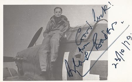 (1910 - 1982) RAF ace credited with 20 aerial victories, four shared victories, six probables, one shared probable and 11 enemy aircraft damaged. Captured in 1941, he befriended German contemporary Adolf Galland. His many escape attempts landed him in Colditz Castle. S.P. 5 1/2" x 3 1/2" b/w, a wartime pose atop the wing of his fighter, signed in 1979. Fine.