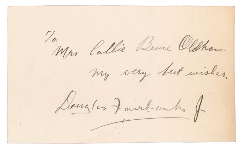 DOUGLAS ELTON FAIRBANKS, JR. (1909 - 2000) American actor and a highly decorated naval officer of World War II. Signed card βTo Mrs. Collie Bruce Oldham, My very best wishes, Douglas Fairbanks, Jr.β. 5β x 3β. Mounting trace on verso. Fine.