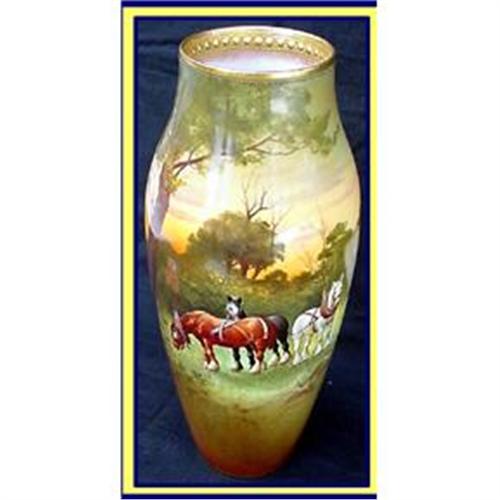 Rare jeweled handpainted horses in a landscape artist signed vase made in England by Royal Doulton c 1902-22. Artist signed H Morrey. <BR>Measures 11 1/2inches tall.<BR>The entire vase is handpainted in a continuous scene of a landscape with purple mountains in the distance, a brook flowing under a bridge, logger moving logs near a bonfire and 3 wonderful horses standing under the trees. Upper rim is heavilly gilded and jeweled both inside and out.<BR>Artist signed H Morrey and marked underneath with the Royal Doulton mark for 1902-22. <BR>Vase appears to be in excellent condition, but close inspection reveals that there has been restoration to the inside, near the upper rim.