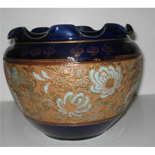 A Doulton Lambeth jardinierre with the traditional cobalt blue glaze. The main body with a floral gold and blue chine decoration. The cobalt blue glaze has "dipped" in 2 places around the rim [a factory fault] which adds some extra character to the piece. It is in good unrestored original condition. Fully impressed & backstamped