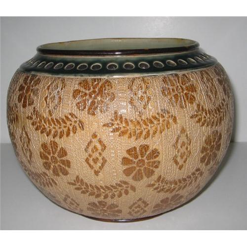 A late Victorian Doulton Lambeth jardinierre by the artist Nellie Garbutt C1882. This is possibly a test piece with markings to the bottom detailing possible changes to the design. It has an unusual pierced rim & the bottom has been drilled but does not detract from the overall quality. Fully impressed & backstamped