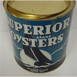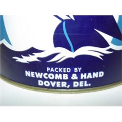 DOVER, DELAWARE OYSTER TIN. 1 gallon. Front and back is decorated with sailboat and text reads "Superior Brand Oysters-Packed by Newcomb & Hand-Dover, Del." Minor denting to top of lid.