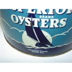DOVER, DELAWARE OYSTER TIN. 1/2 gallon. Front and back is decorated with sailboat and text reads "Superior Brand Oysters-Packed by Newcomb & Hand-Dover, Del." Rusting to top and bottom. Good overall condition.