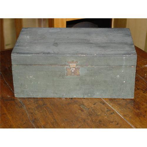 THIS IS A GREAT EARLY BOX , PROBARLY USED FOR THE STORAGE OF DOCUMENTS OR PAPERS, IT LOOKS TO BE MADE IN THE MIDDLE 19TH CENTURY, IT HAS DOVETAIL CONTRUCTION, AND ORIGINAL GREEN PAINT, THE LOCK IS COMPLETE BUT THERE IS NO KEY.