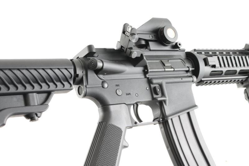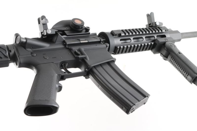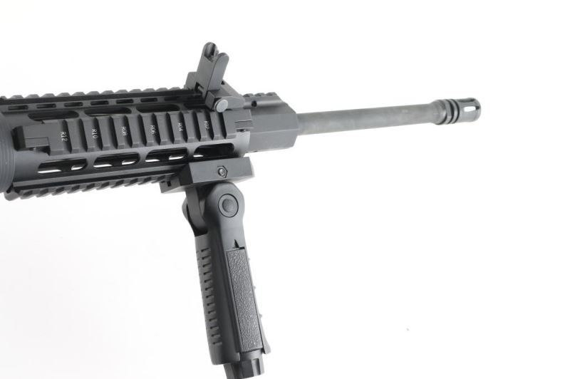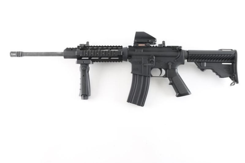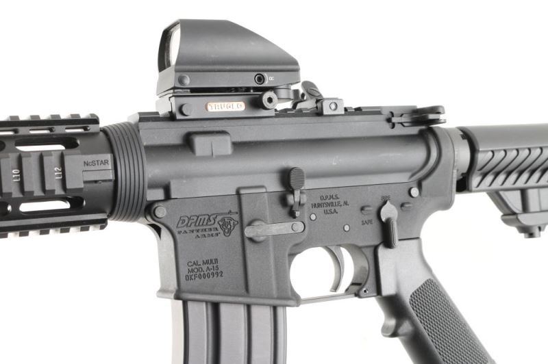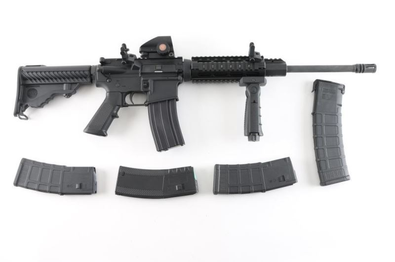 Made in America, this is a direct impingement operated semi-automatic AR pattern modern sporting rifle chambered in 5.56x45mm NATO. It features a black matte finish on the receiver and 18" barrel with flash hider and 1:9 twist. It offers an adjustable DPMS stock, a NcStar quad forend with folding post fore grip. It has a Truglo Red/Green dot that does not seem to work. It has canted pop up iron sights and comes with a total of five (5) magazines. 1 D&H Tactical metal 30 round, 1 Troy Industries poly 30 round, 2 PMAG 30 round and 1 PMAG 40 round. Bore looks great, bright. Finish looks good, just minor handling marks on barrel. Condition is NRA Very Good **Modern Firearm**