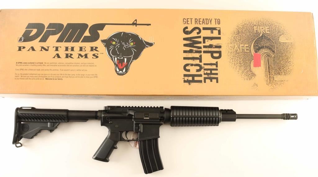 Rifle, semi-automatic. AR-15 style rifle by Panther Arms/DPMS. 17" barrel. Matte-black finish, and black polymer adjustable stock, and hand guards. Scope rail on receiver. Bore is excellent/bright. Comes with 1 30-rd magazine. In original Panther Arms box. Rifle is in like new condition with tags still attached. NRA Condition-Excellent. Modern Firearm.