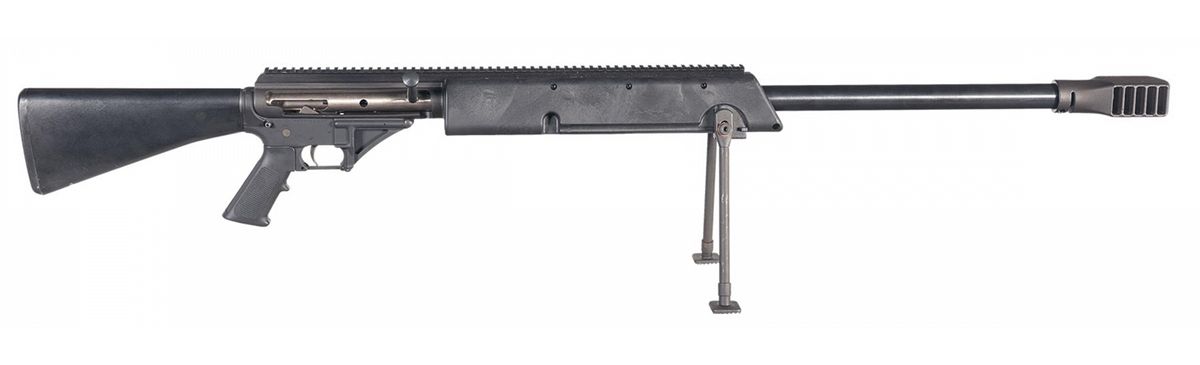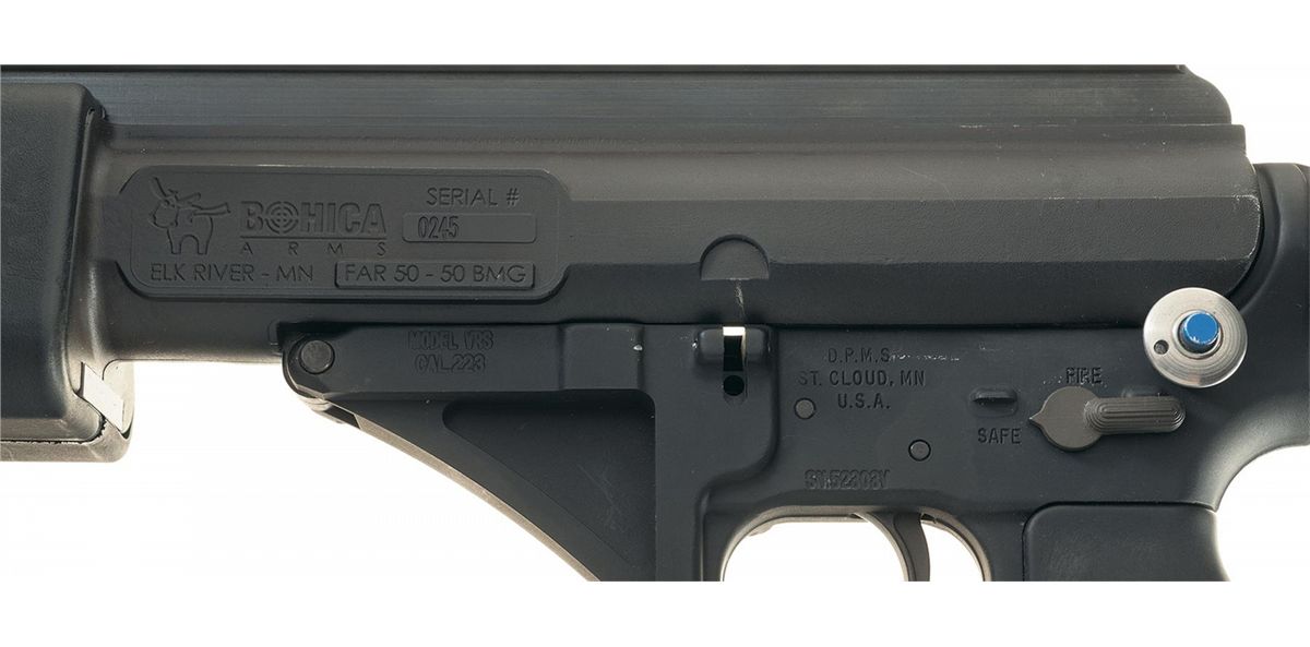 This is a single shot bolt action rifle upper receiver/barrel group fitted with a DPMS AR-15 pattern lower receiver, buttstock and pistol grip. The upper receiver is fitted with a massive heavy 31 inch long barrel, with a full-length Picatinny-style rail that runs the length of the upper and rear section of the barrel. It has a 5-slot muzzle brake mounted to the heavy barrel. The left side of the upper and lower bear the Bohica and DPMS maker's marks and model information, respectively. With a swiveling bipod, textured forearm, checkered pistol grip and buttplate. With plastic hardcase and manual.