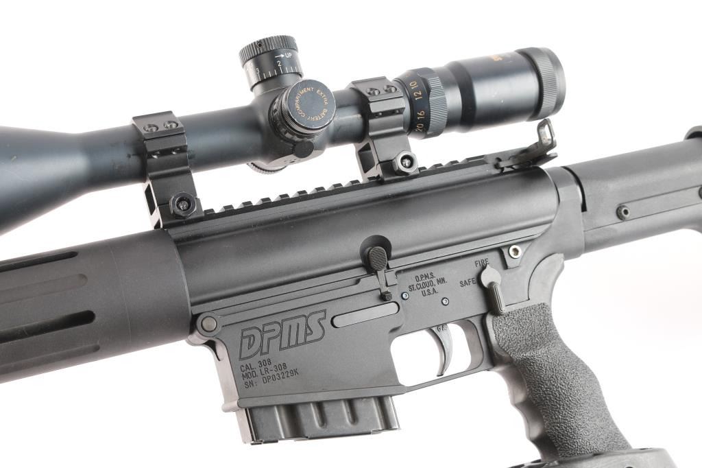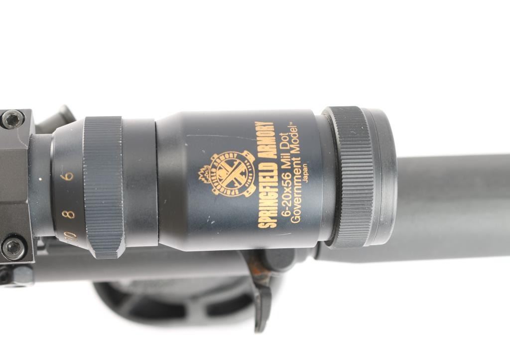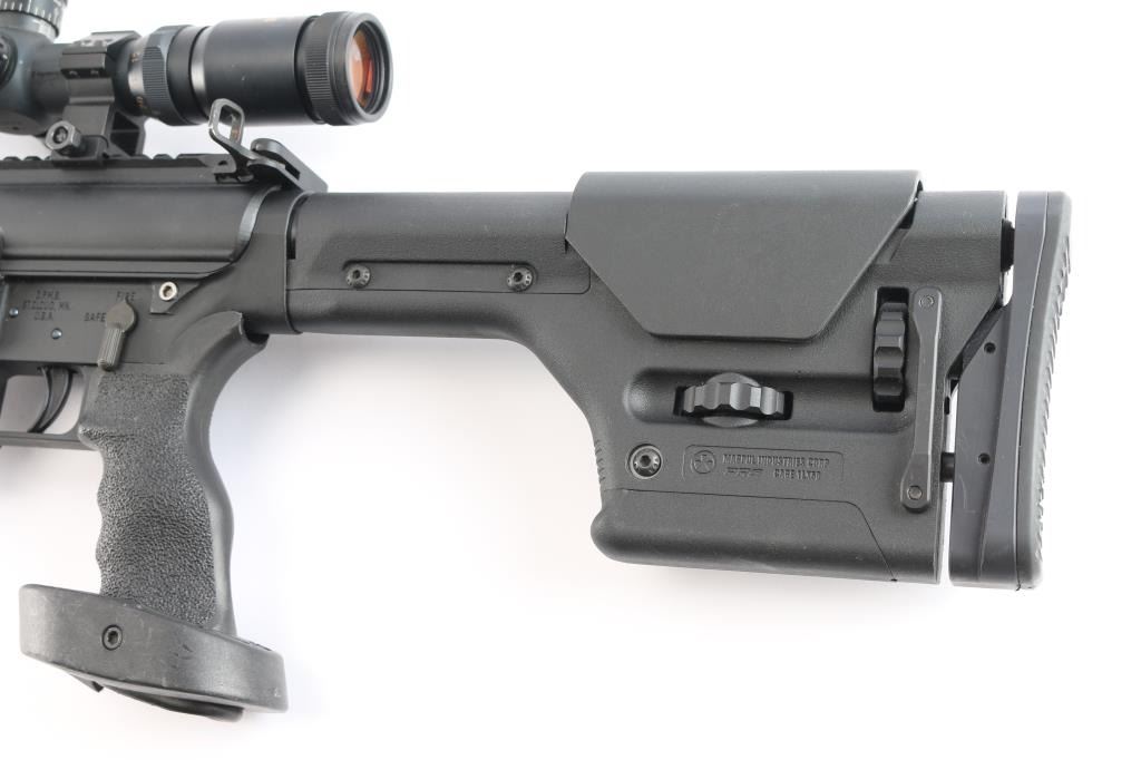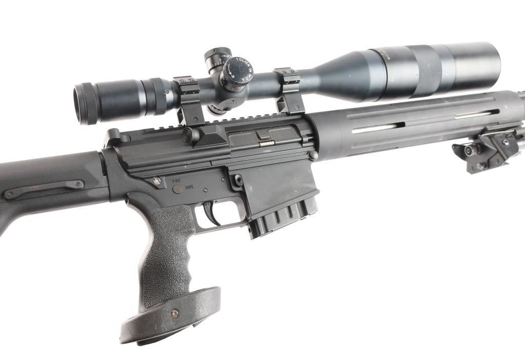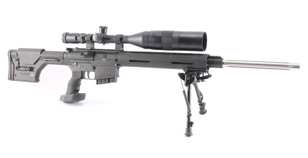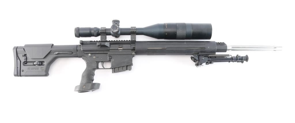 Panther Arms pattern AR-10 semi-automatic rifle. Features an aluminum free float handguard, Upgraded with a Geissele competition 3 lb trigger, 24" stainless 1/10 bull barrel, fluted with recessed crown, fully adjustable Magpul Precision Rifle Stock, target-style pistol grip with an adjustable hand shelf, combo forward assist/shell deflector. 2' optics rail installed on barrel, Harris SL M bipod installed, Charging Handle with Extended Latch. Mounted with a Springfield Armory 6-20X56 Mil-Dot Government model scope Armory with sun shade, clear optics. Bore is excellent/bright, overall very good with minor scratches/scuffs.